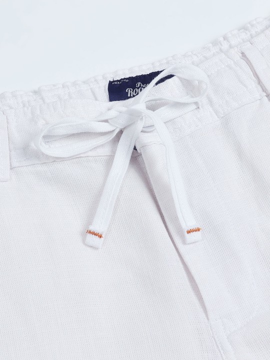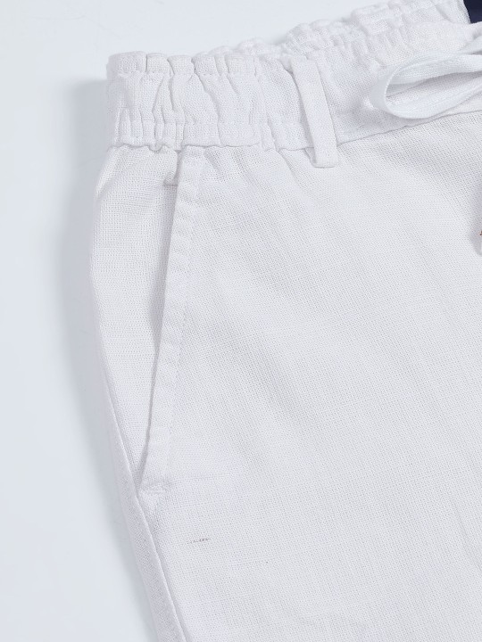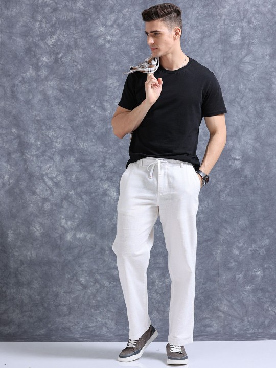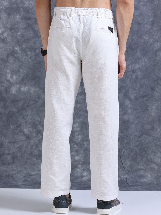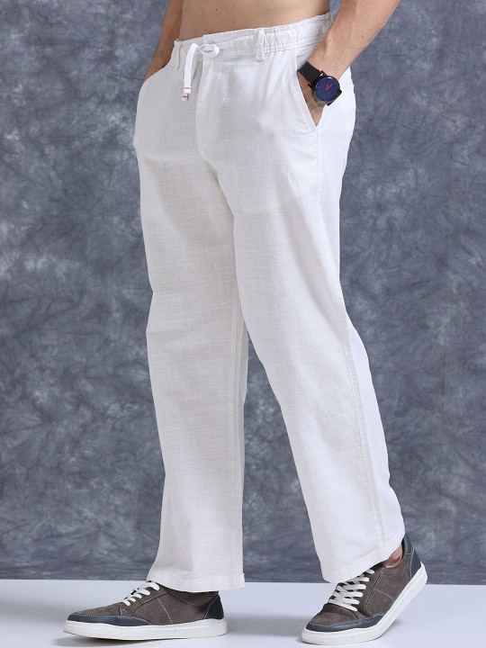 + Free ShippingWhite solid relaxed-fit mid-rise regular trousers, has a partially elasticated waistband with drawstring closure